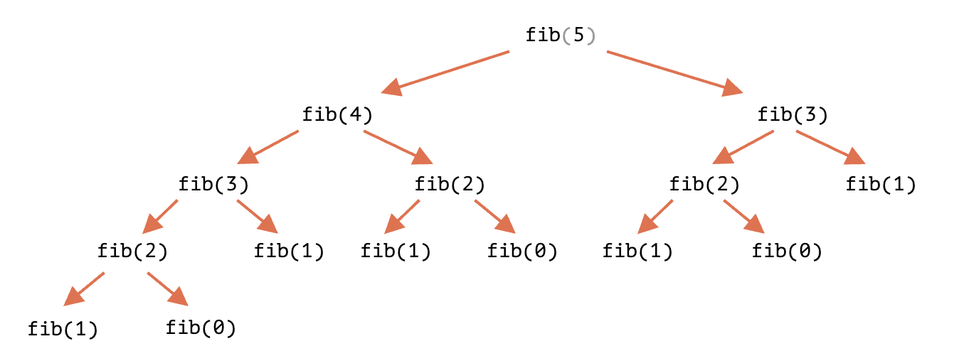 피보나치 수는 재귀적인 방식으로 해결이 가능합니다. 왜냐하면 5번째 항은 3,4번째 항의 합이기 때문이죠. 이를 그림으로 나타내면 다음과 같습니다.