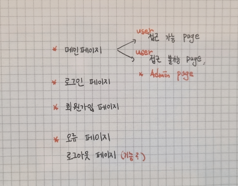- 메인 페이지 : 메인페이지는 회원이 접근할 수 있는 페이지와 비 회원이 접근할 수 있는 페이지가 나눠져 있을 것이다. 경우에 따라선 회원전용 페이지만 있을 수도 있겠다.