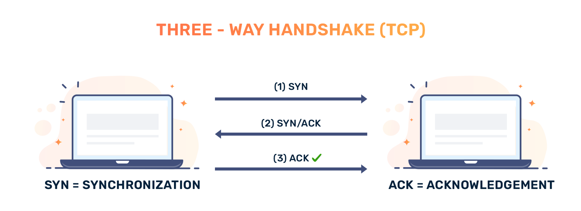 내 컴퓨터(클라이언트)와 서버 간에 데이터 패킷을 전송하려면 TCP 연결을 해야 한다. 이 연결은 TCP/IP 3-way handshake라는 연결 과정을 통해 이뤄진다. 클라이언트와 서버가 SYN(synchronize: 연결 요청) 및 ACK(acknowledgement: 승인) 메시지를 교환하여 연결을 설정하는 3단계 프로세스이다.