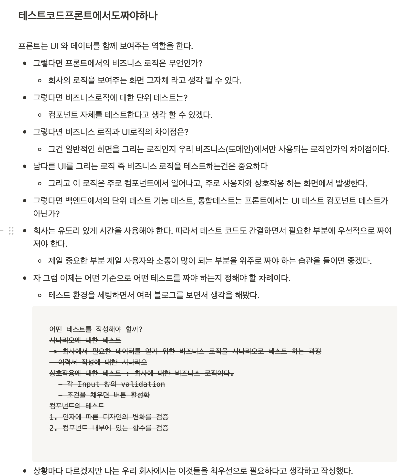 예전에도 프론트엔드 테스트가 왜 필요한지에 대한 의문이 들어서 조사한 후 블로그 글을 작성한 적이 있었다. 하지만 직접 와닿지 않아 원동력이 그렇게 오래 가지 못했고, 결국 휘발되는 기억 중 하나가 되어 버렸던 경험이 있다.