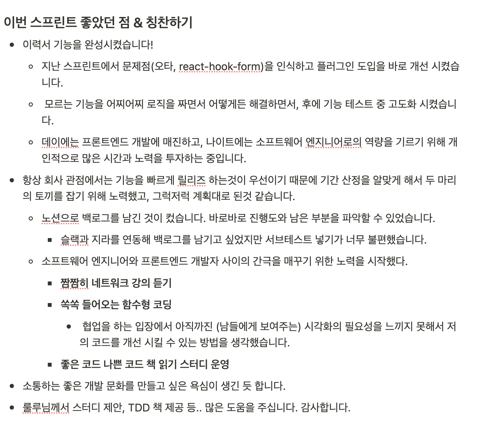 이번달에 기쁜 소식과 함께 올해를 마무리할 수 있어서 정말 다행이라는 생각이 든다. 부족한점도 많았지만 스스로의 회고와 학습을 하는 자세가 나에게 큰 힘이 되어 주었다. 한 줄로 정리 해도 되겠어.