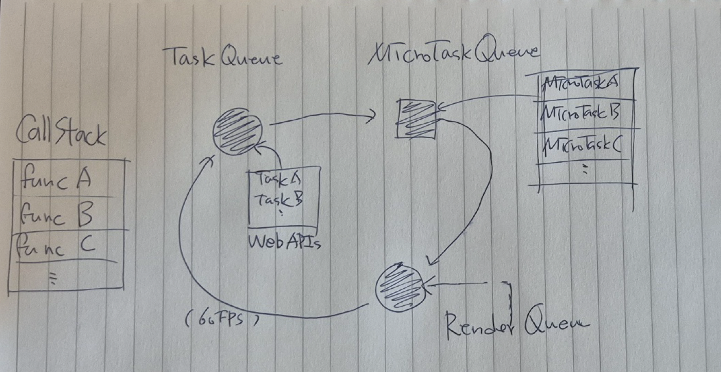 이벤트 루프 사이클 마다 Task Queue로에서 작업을 꺼내서 실행시킨다. 작업이 완료 되면 render Queue로 넘어가는데 render Queue에 작업이 없을 때 다른 Task를 Task Queue로에서 꺼내서 실행 시킨다.