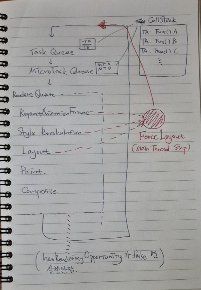 force layout이 발생하면 브라우저는 콜스택이 비어있지 않아도 JS의 메인스레드를 멈춥니다.