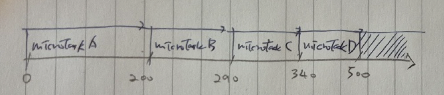 우리는 3개의 태스크(A, B, C)를 가지고 있습니다. 이벤트 루프는 첫 번째 태스크(A)를 가져와 실행하며, 이는 4ms가 소요됩니다.