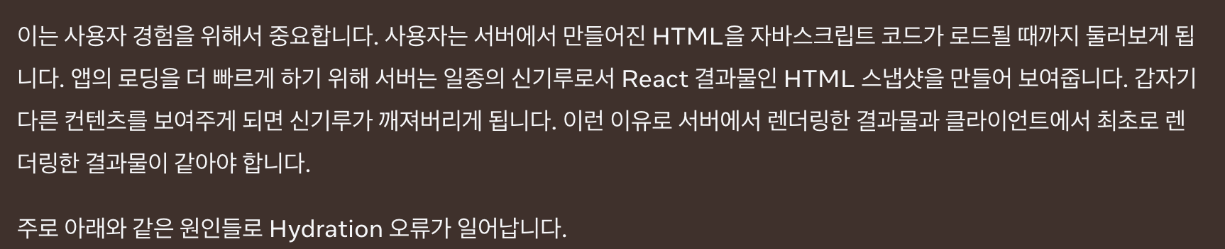 서버에서 사전으로 렌더링 된 결과물과 리액트에서 hydration한 결과물이 다르면 신기루가 깨져요. 깜빡이면서 다른 화면이 렌더링 되겠죠 ? (즉 전혀 다른 초기 화면이 렌더링 될것이다.)